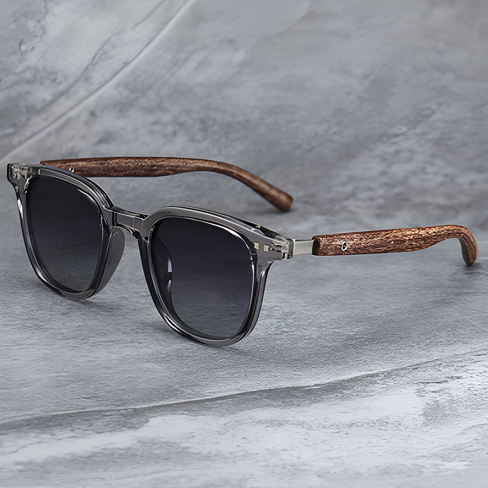 These square frame sunglasses offer a sophisticated touch to your daily ensemble. Designed with a matte finish and distinctive wooden arms, they provide a refined look suitable for everyday wear. The dark lenses and subtle metal accents complete this elegant accessory.